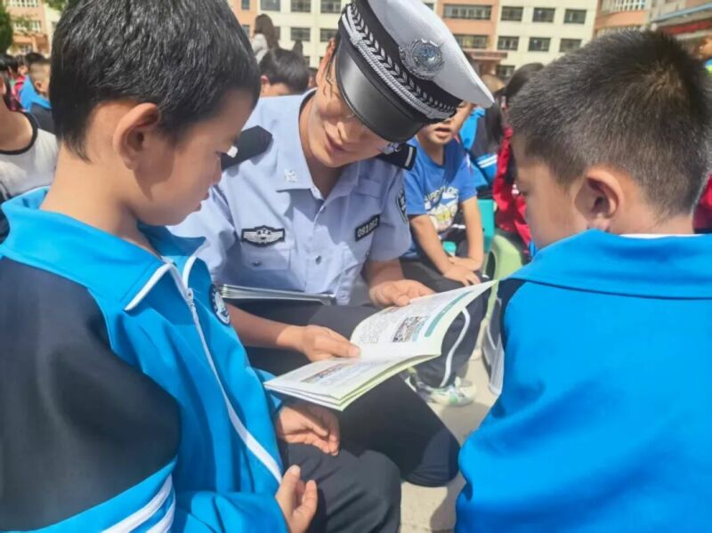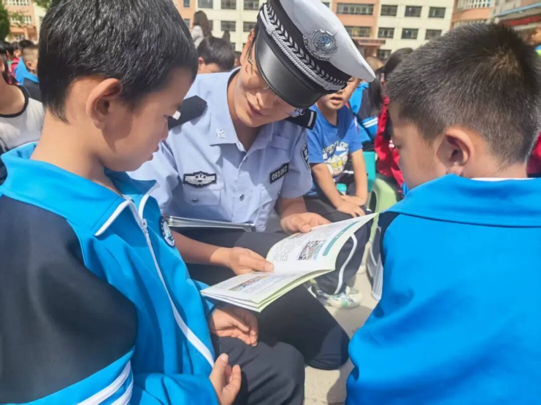 活动中,民辅警首先向同学们讲解了交通信号灯、交通标志以及如何安全过马路、骑自行车等基本交通安全知识。随后根据学校地理位置,结合小学生的认知特点,用生动通俗的语言,围绕“步行安全”“乘车安全”,详细讲解“红灯停、绿灯行”“走斑马线过马路”“不横穿马路追逐打闹”等交通规则让同学们认识到乘车不系安全带、随意横穿马路、闯红灯、在道路上追逐打闹、攀爬车辆等行为的严重危害,警示学生们要自觉做到“知危险、会避险”,提高自我安全保护意识。同时,民辅警向学生发放中小学生交通安全手册,手册上清晰标注常见交通标志、出行风险点及应对方法,既方便学生课后复习巩固,也能引导他们将安全知识传递给家长,真正实现“教育一个学生,影响一个家庭”的宣传效果。