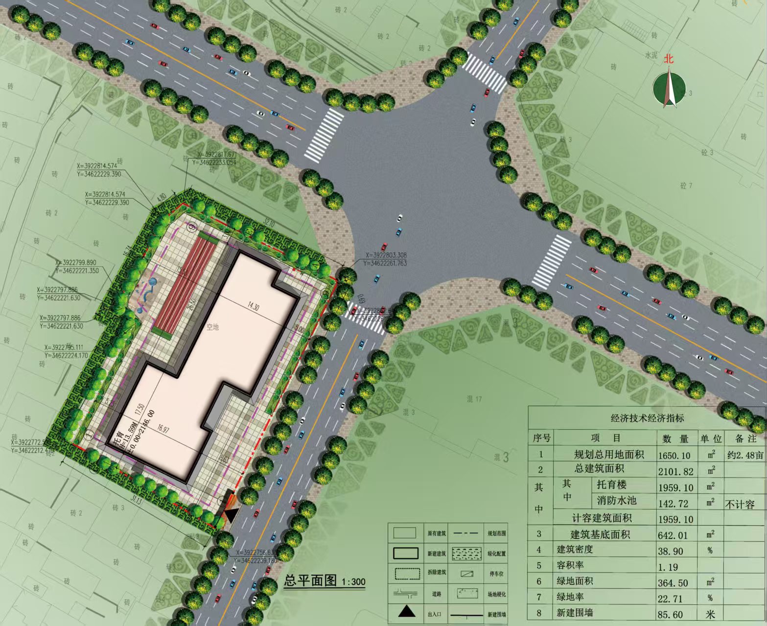 总建筑面积2101.82㎡,拟建托育楼1栋,并配建消防水池等配套服务设施,容积率1.19,建筑密度38.9%,绿地率22.71%。