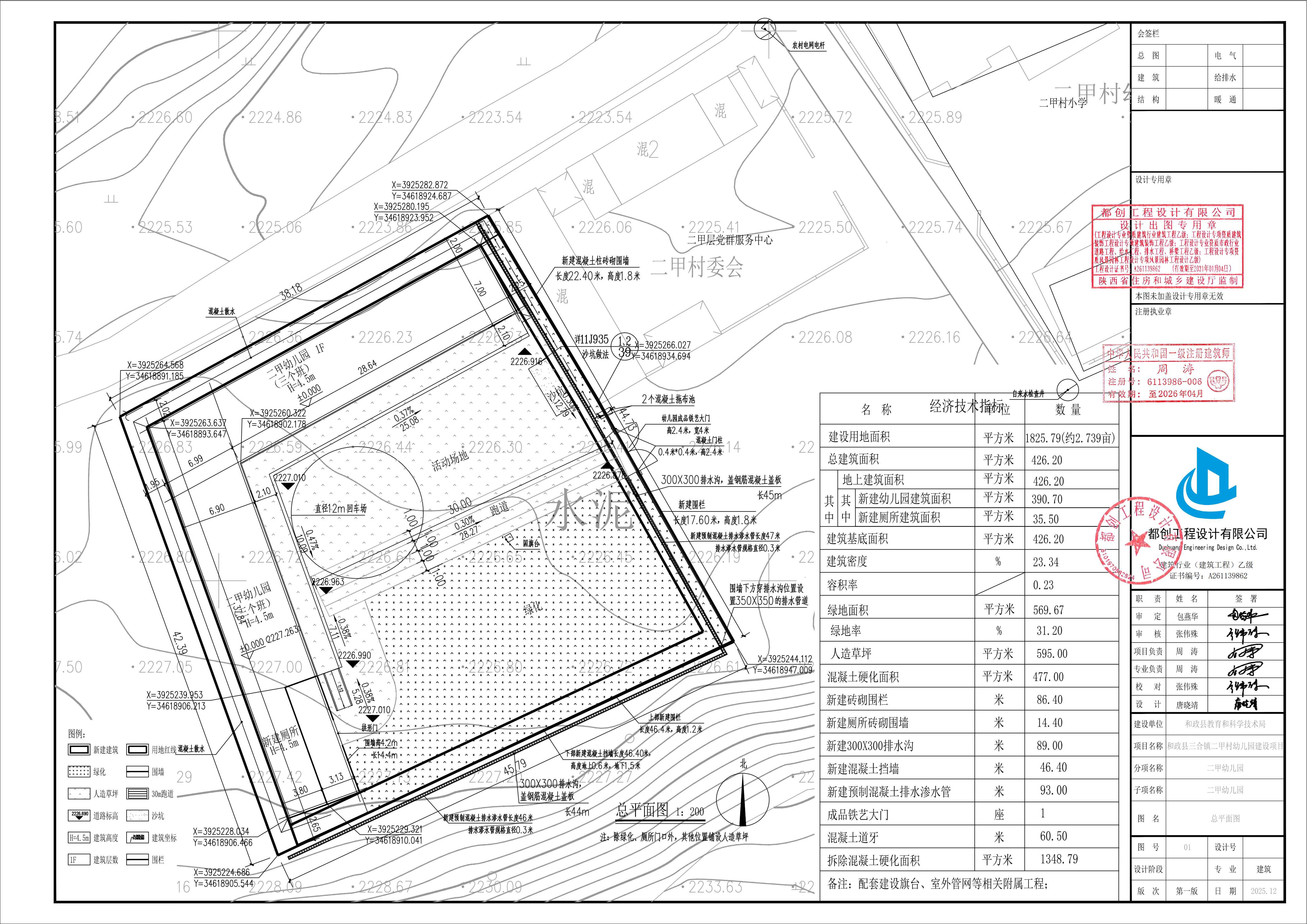项目总用地面积为1825.79平方米(2.739亩),总建筑面积426.2平方米,其中新建一层幼儿园建筑390.7平方米及新建一层厕所35.5平方米。同时新建混凝土硬化、砖砌围墙、排水沟、混凝土挡墙、绿地、旗台室外管网等相关附属工程。