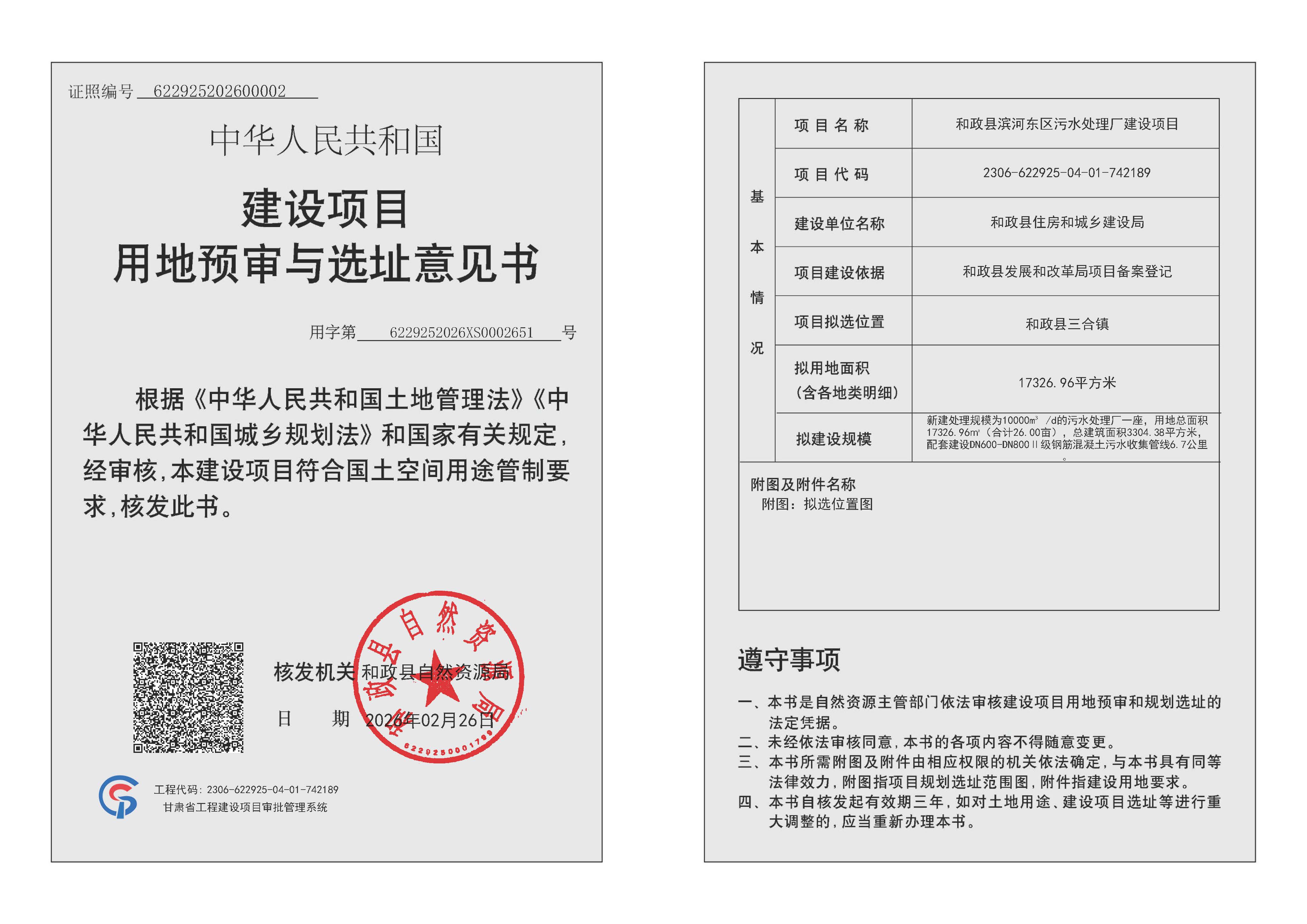 和政县住房和城乡建设局向我单位申请办理和政县滨河东区污水处理厂建设项目用地预审与选址意见书,我单位按程序对申报材料进行了审核并做出予以办理的决定,现依据《中华人民共和国行政许可法》《中华人民共和国城乡规划法》《自然资源领域基层政务公开标准指引》等相关法律规定,对许可证证载内容进行公布: