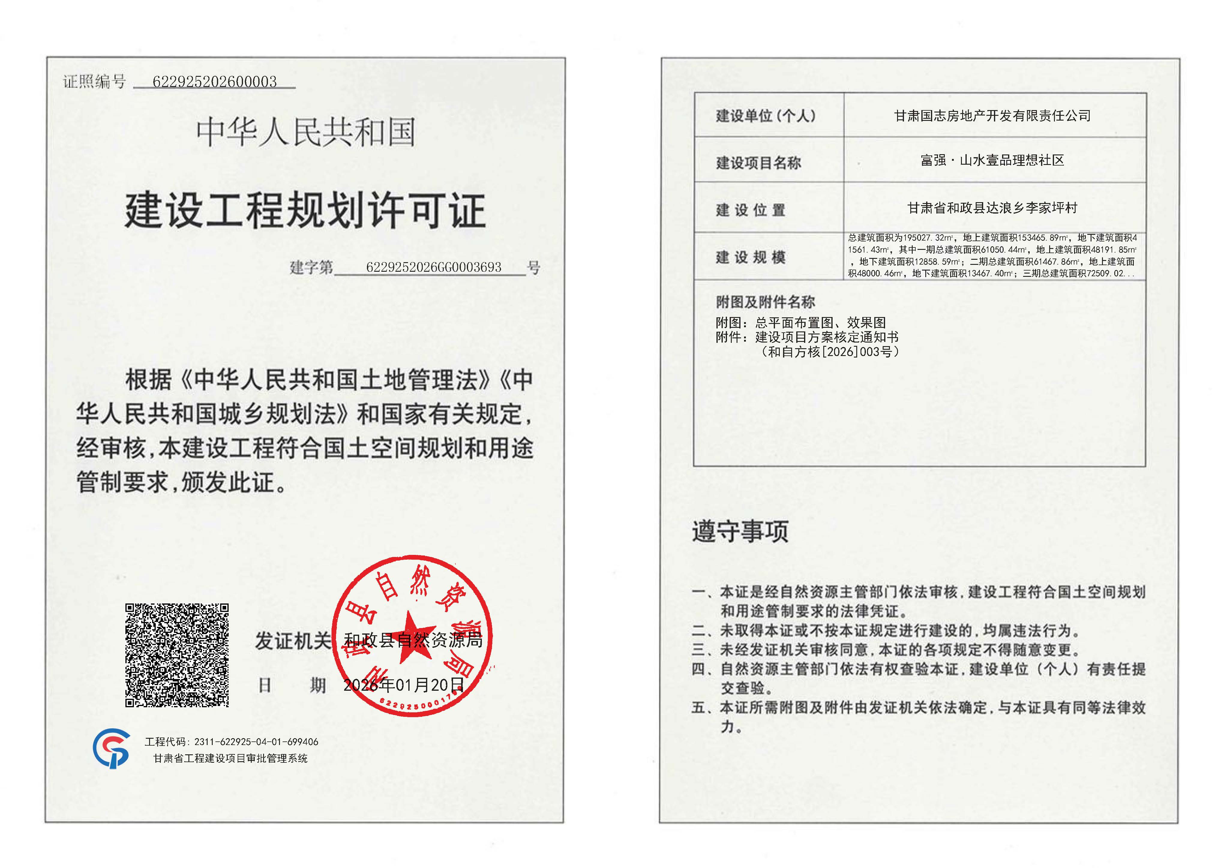 甘肃国志房地产开发有限责任公司向我单位申请办理富强·山水壹品理想社区(变更)建设项目建设工程规划许可证,我单位按程序对申报材料进行了审核并做出予以办理的决定,现依据《中华人民共和国行政许可法》《中华人民共和国城乡规划法》《自然资源领域基层政务公开标准指引》等相关法律规定,对许可证证载内容进行公布: