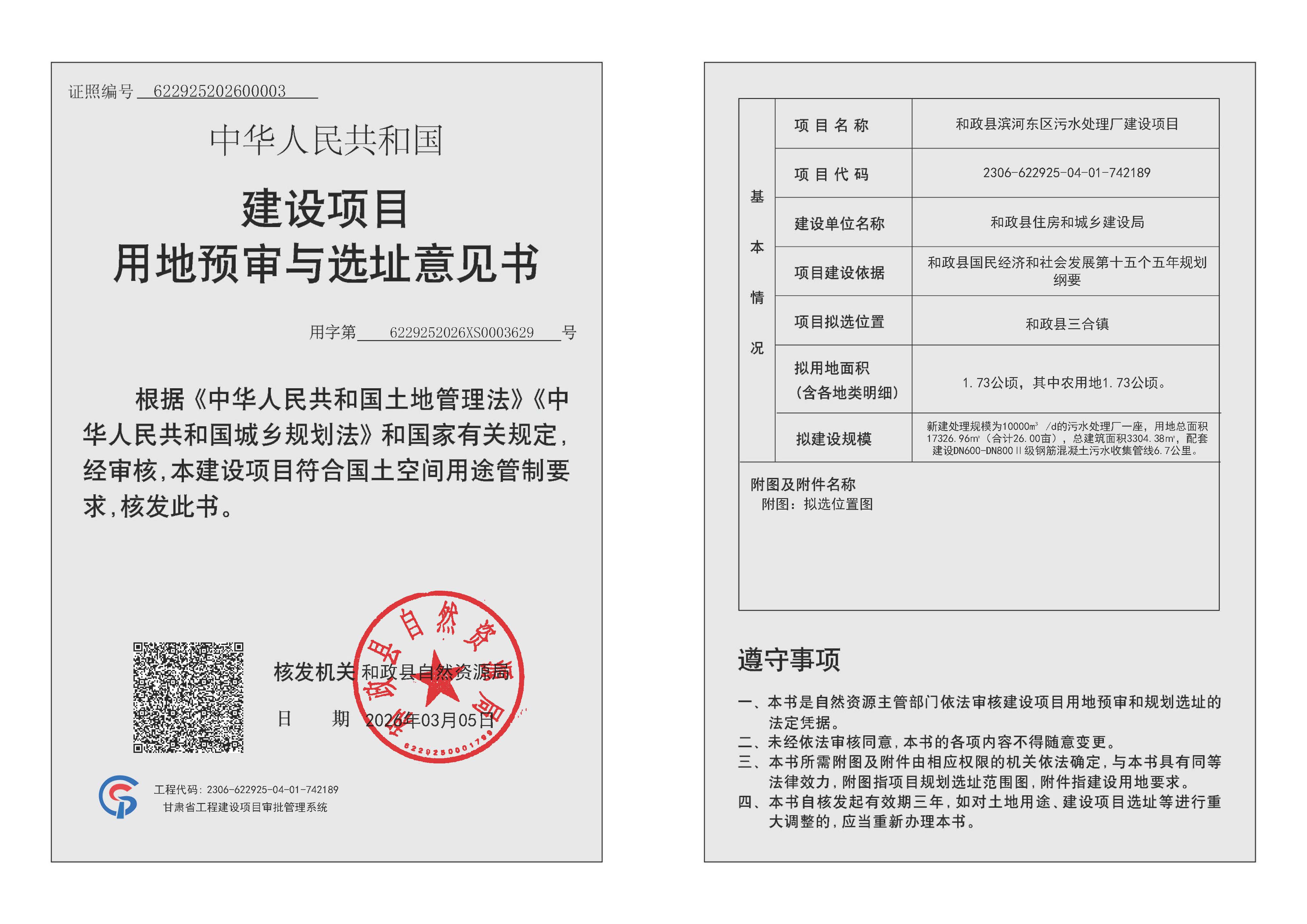 和政县住房和城乡建设局向我单位申请办理和政县滨河东区污水处理厂建设项目用地预审与选址意见书,我单位按程序对申报材料进行了审核并做出予以办理的决定,现依据《中华人民共和国行政许可法》《中华人民共和国城乡规划法》《自然资源领域基层政务公开标准指引》等相关法律规定,对许可证证载内容进行公布: