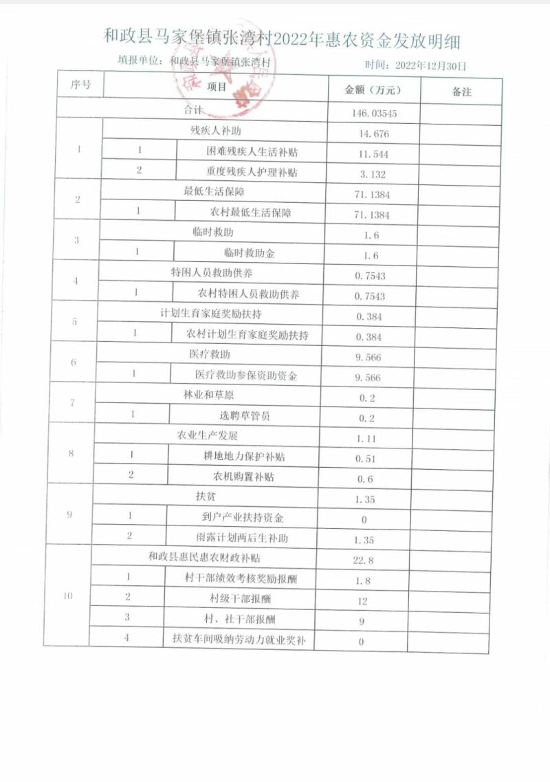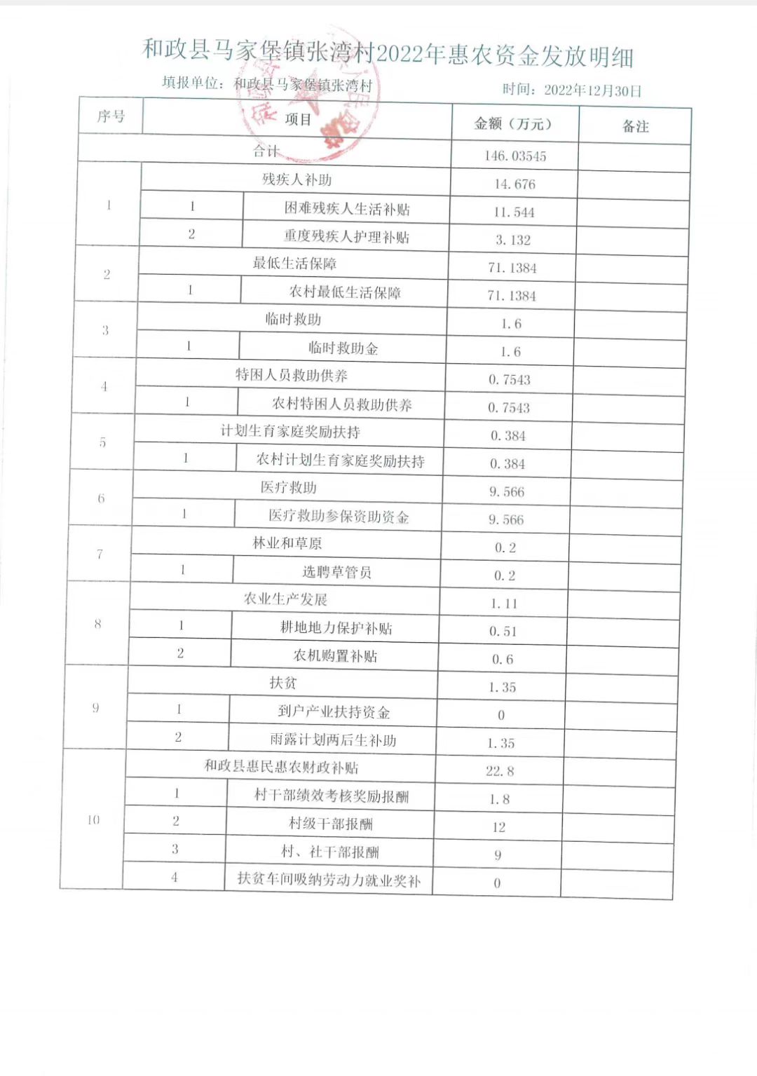 和政县马家堡镇张湾村2022年惠农资金发放情况公示